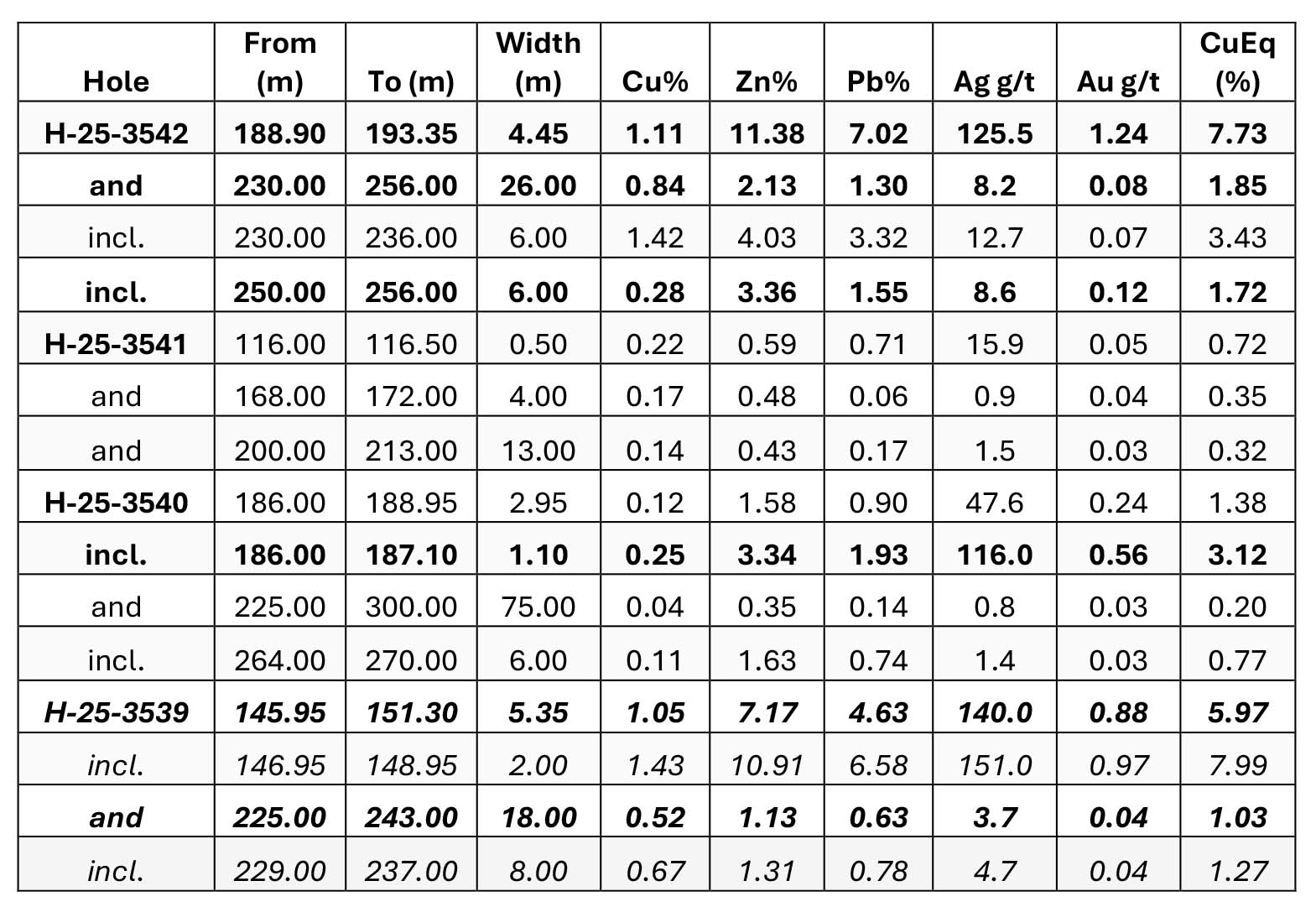 Table 1. Assay Highlights. CuEq% as per estimated recovered metal prices of September 16, 2025 (see notes 1 & 2 at end of release for additional explanation). H-25-3539 results previously released. H-25-3542 is a 50 m step-out west of H-25-3539. H-25-3541 is a 50 m step-out east of H-25-3539. H-25-3540 is a 50 m step-out north (down dip of H-25-3539).