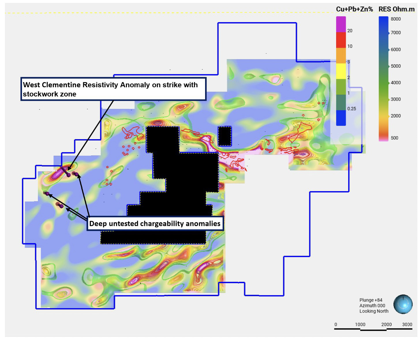 Figure 1. Buchans Project: 2026 winter drilling plan and resistivity plan map (200 m depth slice) with resistivity isoshells. Red lines outline previously mined deposits and areas of known mineralization projected vertically to surface.